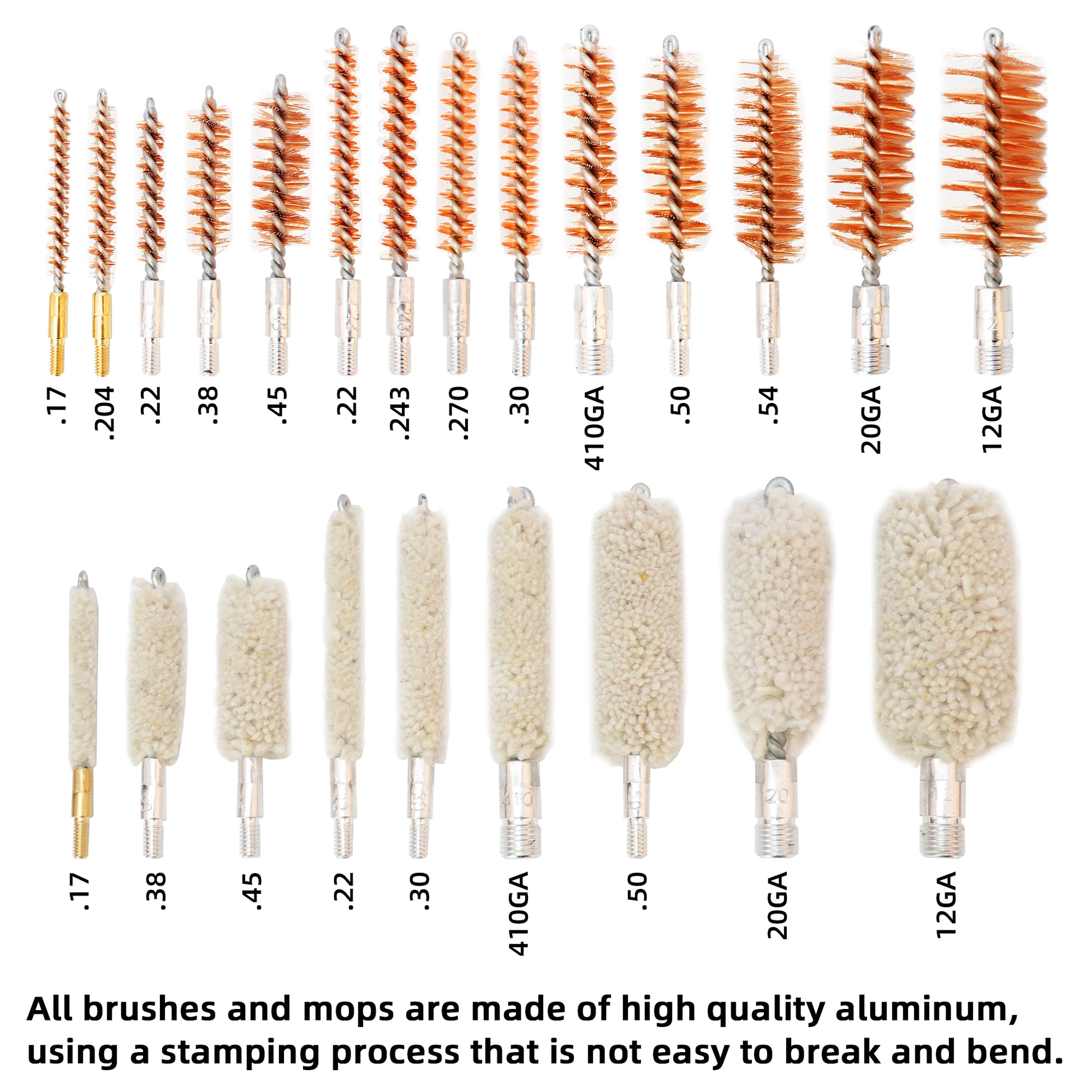 - 【Package Includes】- The Universal Gun Cleaning Kit Includes 3 Solid Brass Gun Cleaning Rods For 17-270 Caliber Rifles; 3 Solid Brass Gun Cleaning Rods For 30 Caliber Rifles, Pistols, Handguns, Shotguns And Muzzleloaders; And The Gun Cleaning Kit Also Includes 14 Brass Brushes; 9 Mops; 12 Spear-pointed Brass Jags; 1 Powder Brass Jag; 4 Brass Slotted Patch Loops; 3 Utility Brushes; 3 Muzzle Guards; 4 Brass Accessory Adapters; 50pcs 3×3" Cleaning Patches And 1 Stainless Steel Cleaning Pick.